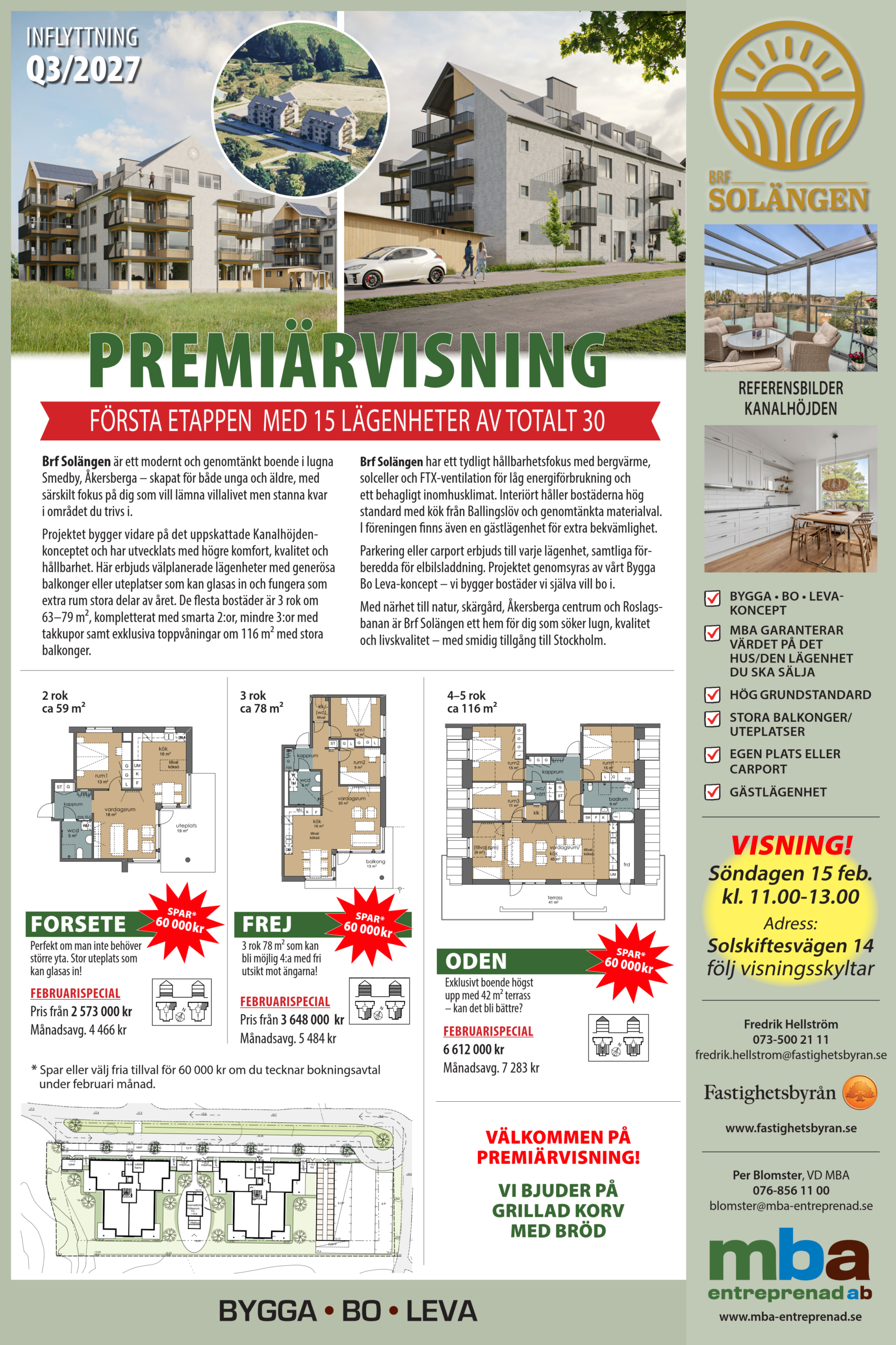 Totalt kommer det att byggas 30 lägenheter. I etapp 1 släppte vi Hus 1 med 15 lägenheter till försäljning i samband med den första visningen på plats den 15/2. Tidpunkt för nästa visning kommer inom kort.